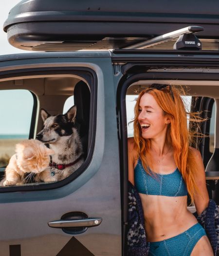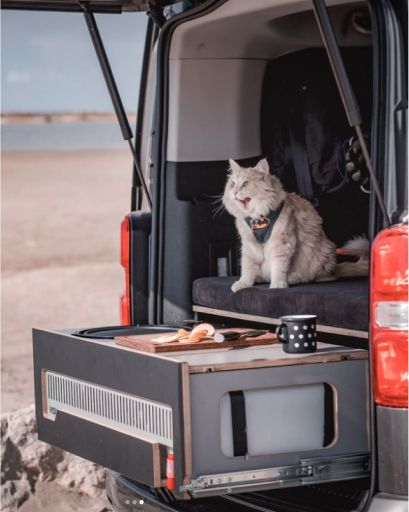 In her spare time, Lucia and her four-legged partner Paul often disappear to the Alps or to the sea. Visu Moie is their living room, kitchen and bedroom on the go.